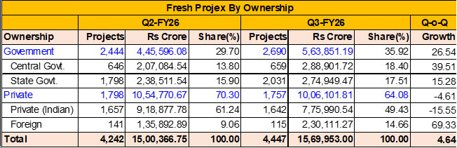 A couple of super mega projects saw the aggregate fresh investment by the Foreign entities increase by 69.33 percent to Rs 2,30,111.27 crore. This was despite the decline in the number of new projects from 141 in Q2/FY26 to 115 in Q3/FY26. The Foreign share increased to 14.66 percent from 9.06 percent (+5.60 pp), partially cushioning the broader private slowdown, but also indicating higher dependence on a small set of super/mega projects. A Rs 98,000 crore AI Data Centre of Digital Connexion at Visakhapatnam, Andhra Pradesh and a Rs 24,000 crore Closed Loop Pumped Storage Project of Greenko Energies in Telangana were the two super mega projects announced in Private (Foreign) sector.